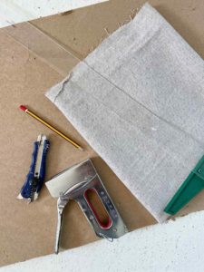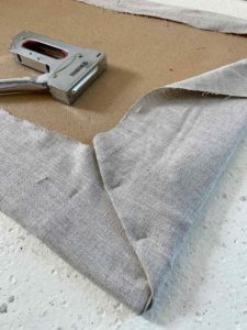Læg stoffet over pladen, træk det stramt bagom og fastgør det med hæftepistolen. Start på midten af hver side, og arbejd dig ud mod hjørnerne, så stoffet bliver jævnt og uden folder.