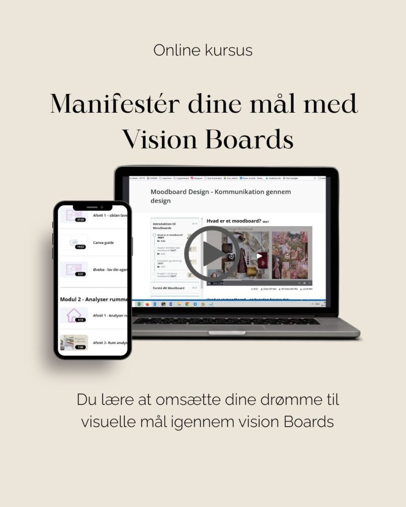 Jeg har lavet Moodboard Masterclass, fordi jeg ved, hvor stor en forskel moodboards kan gøre – både professionelt og privat. I masterclassen lærer du trin for trin, hvordan du laver moodboards, der ikke bare er smukke, men også et stærkt værktøj til at tage bedre beslutninger, kommunikere tydeligt og styrke dit brand.